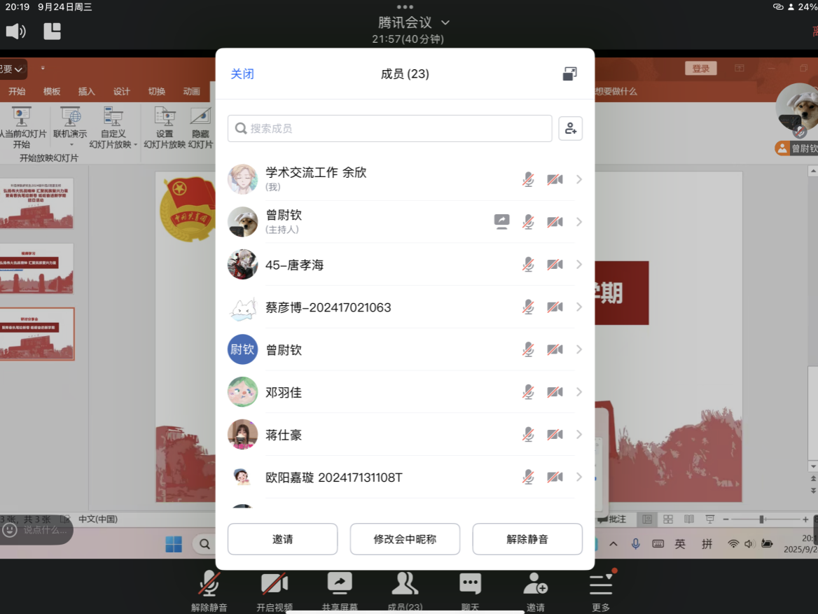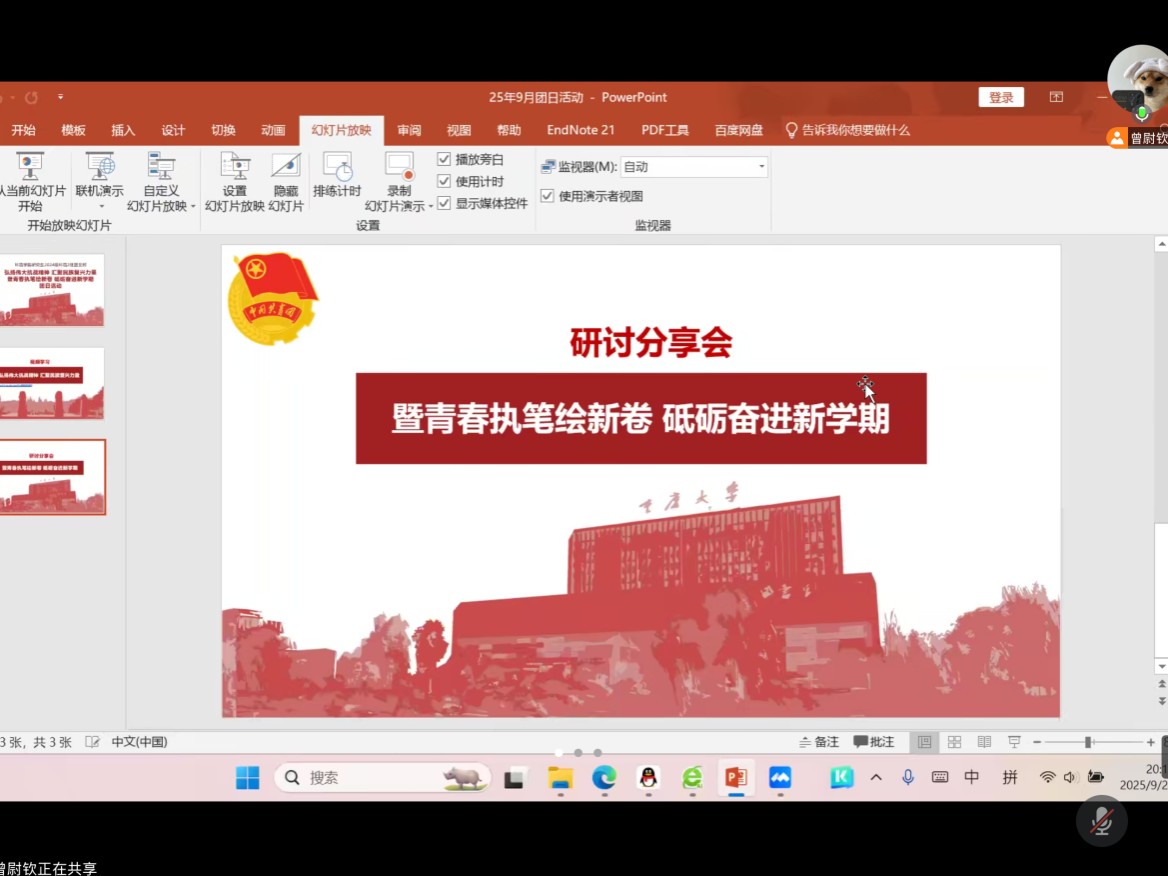 为纪念抗战胜利80周年,深入弘扬伟大抗战精神,引导青年学子将红色基因融入环境专业学习与实践,2025年9月24日晚8:00-10:00,重庆大学环境与生态学院24级环境2班团支部依托腾讯会议,以线上形式开展“弘扬伟大抗战精神,汇聚民族复兴力量”主题团日活动。活动分“回望抗战历程”“规划新学期奋进方向”两阶段推进,通过“视频学习+线上研讨”的形式,凝聚团员思想共识,激发新时代青年的使命担当。