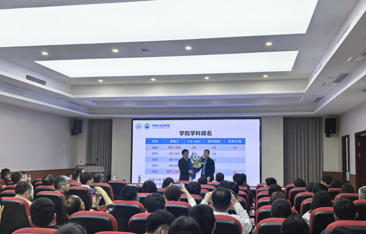 陈一围绕环境科学与工程一级学科建设工作作汇报,内容涵盖学院在坚定的社会主义办学方向、卓越的拔尖创新人才培养贡献、突出的国家战略支撑成效、广泛的全球影响力与引领力、完善的治理体系与治理能力等方面取得的成绩。